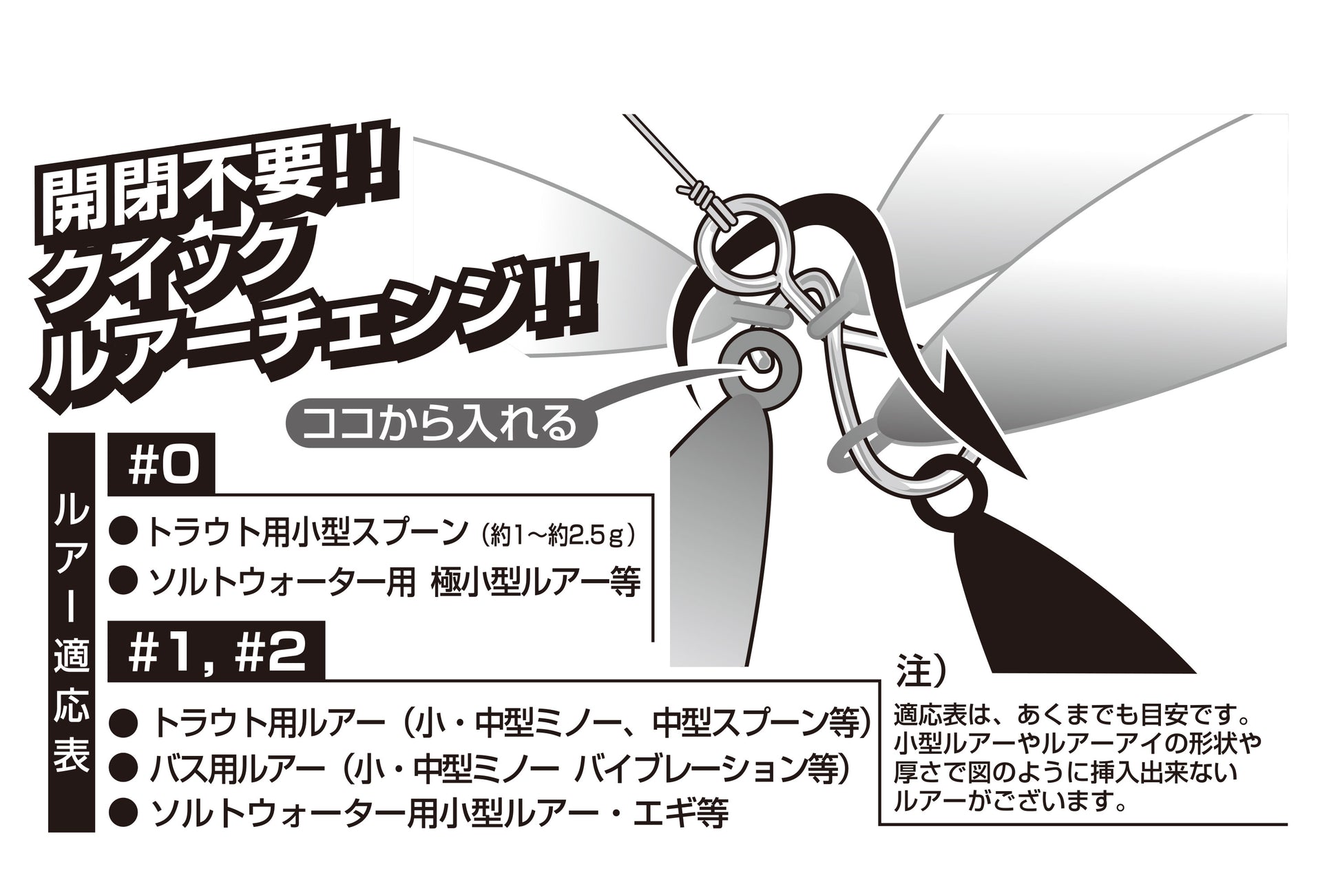 ルアー交換時のわずらわしいスナップの開閉作業なく、スムーズにクイックに着脱できる、スナップの常識が変わる?! 開閉不要カンタンスナップです。ベント部もラウンドベント形状で、ルアーアクションを損なわず、あらゆるアクションに対応。アイ・シーム部にはSOLDERING加工を施し、強度不安を解消、特に厳寒期がメインとなるエリアフィッシングやメバリング等に最適。かじかむ手での開閉作業がないのでオススメします。